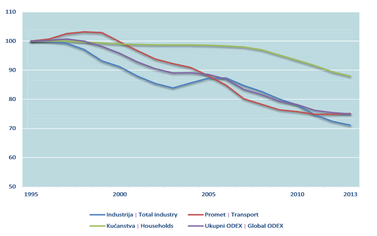 U promatranom razdoblju od 1995. do 2013. godine uočljivo je smanjenje indeksa poboljšanja energetske učinkovitosti, odnosno poboljšanje energetske učinkovitosti za ukupno gospodarstvo u Hrvatskoj za 25,1 % za sve finalne potrošače energije promatrane zajedno. Ovoj pozitivnoj promjeni najviše su pridonijeli sektori industrije i prometa s poboljšanjem indeksa energetske učinkovitosti za 28,9 i 24,9 %.